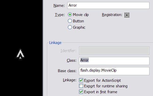 Create a new Flash document. Draw an arrow on the stage, convert it to a symbol named “Arrow” and export it for ActionScript.
