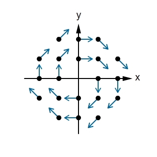 This is a visualized graph of a vector field. The output vector of a given input vector (1, 2) is (0.5, 0.5), while the output of an input (4, 3) is (-0.5, 0.5).