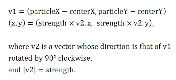 The getMotionData2D takes a Particle2D parameter as input, which contains the position vector information of the particle, and that’s the input to the field. The method returns a MotionData2D object, representing the output of the field. That’s all you need to know to create a custom field. Let’s create a custom vortex field.