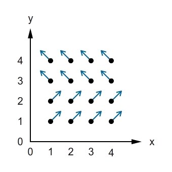 This is a visualized graph of a vector field. The output vector of a given input vector (1, 2) is (0.5, 0.5), while the output of an input (4, 3) is (-0.5, 0.5).