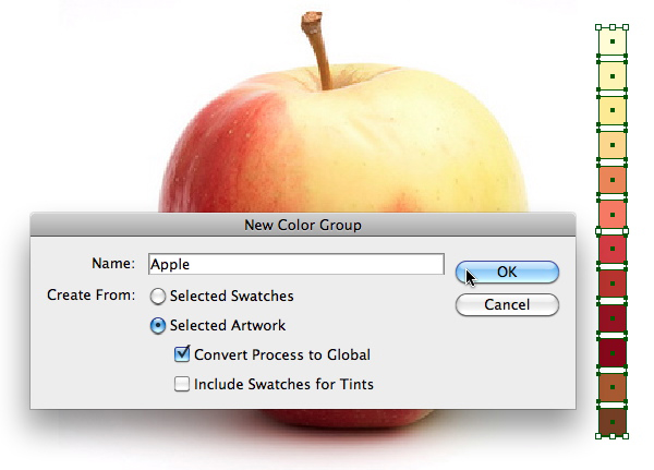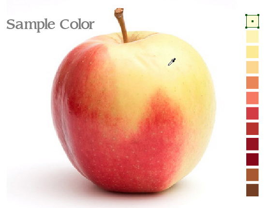 We’ll sample some color from the apple photo with the Eyedropper tool and make a new color group. Draw a series of small squares. Select the first one, then click the Eyedropper on the lightest yellow part of the apple. The square will fill with that yellow. Select the next square and click on a darker yellow. It will speed things up to select the Eyedropper first, then hold down the Command key (PC: Control) to select the next square, then release to get back to the Eyedropper and sample the next color. You can get a rhythm going.