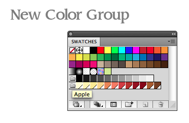 Do this a few more times with the reds, and then the stem. Select all the squares, and click the New Color Group icon at the bottom of the swatches panel. Choose "Selected Artwork" as the source, and name the group if you like. This method, of creating squares and filling them, is much faster than sampling, then dragging the swatch from the Color panel into the Swatches panel, then repeating that ten times.