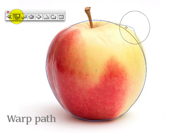 Lock the apple layer and add a new one above it. You can now trace the outline of the apple with the Pen tool, or to speed things up a bit, try this: Draw an ellipse (L) about the size of the apple. Now take the Warp tool (they’ve hidden it under the new Width tool) and push the path so that it conforms to the shape of the apple. Don’t worry about the stem for now. Tip: Adjust the size and aspect ratio of the tool by holding down the Option (PC: Alt) key while dragging.