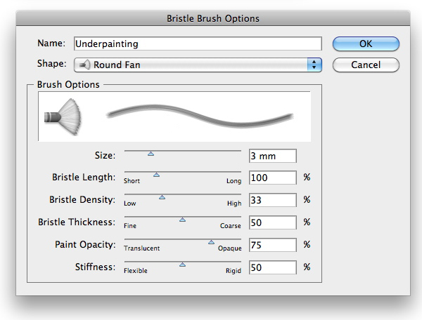 Create a new Bristle Brush by clicking the New Brush icon at the bottom of the Brushes panel. Choose Bristle as the type, then select the Round Fan. We want to go for a light wash effect, so make the size 10mm and adjust the opacity to somewhat transparent.