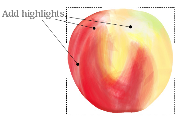 Once the color is modeled to your liking, add some highlights. Paint with white in the highlight areas. Again, you can paint outside the lines of the apple shape.