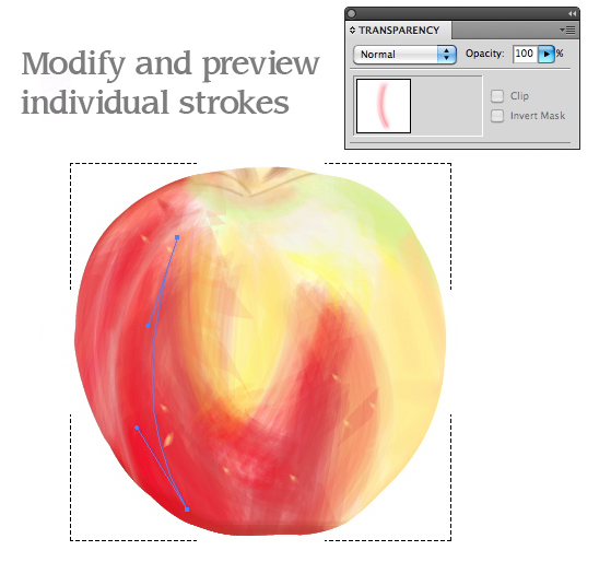 Since the brush strokes don’t always fall exactly along the path, it may be difficult to tell what stroke is actually selected. Switch to Outline mode to more easily select strokes, and view the Transparency panel to get the thumbnail preview of the selected stroke.