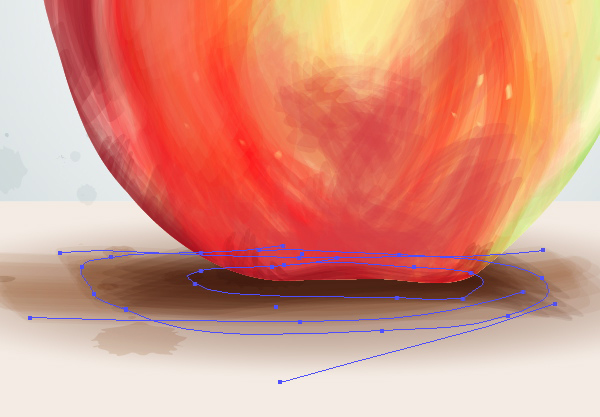Add a shadow and background. For the shadow, I started with an ellipse, then applied a Fan Bristle brush to it. Again, since it’s a vector path, you can adjust the width and shape of the path to get a painterly effect to match that of the apple. I added a couple of strokes with the "Ink Splats" Art Brush to add to the overall painterly look.
