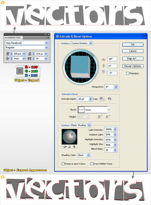 Create a 700 by 300px document. Select the Type Tool (T) and add your text. I’ve used the New Facebook font, but you can use any font you like. Fill your text with the color shown below (R=128 G=128 B=128). Expand the text. Select the resulting group of shapes, add the 3D > Extrude & Bevel effect then go to Object > Expand Appearance.