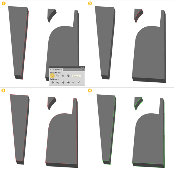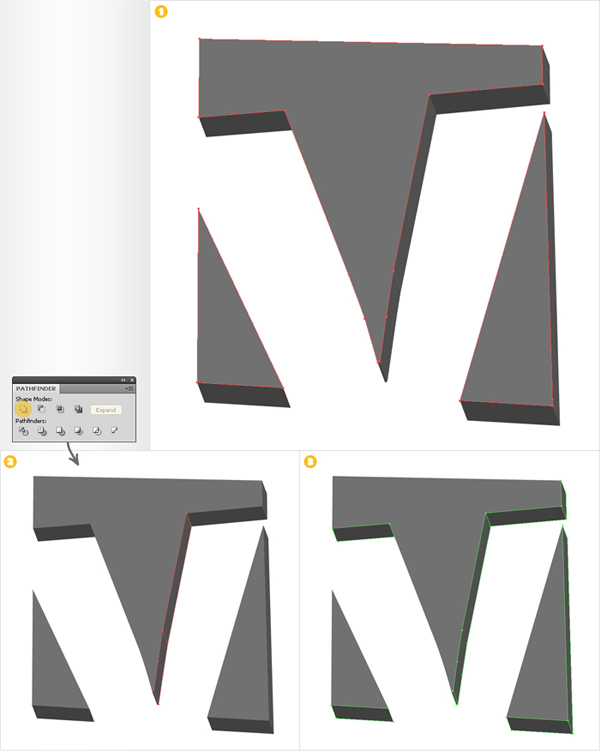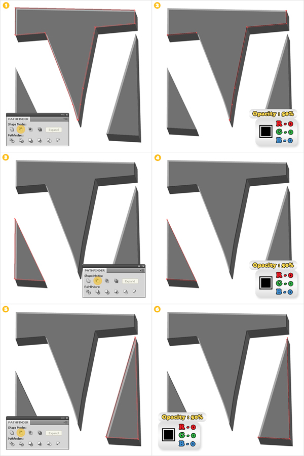 Now, let’s focus on the "V" shapes. Select the shape shown in image #1 and make two copies. Select the top one then press the down arrow and the right arrow twice (to move it 1px to the right and 1px down). Reselect the two copies and click on the Minus Front button from the Pathfinder panel. Fill the resulting shapes with white and lower their opacity to 40%. Repeat the same techniques for the other two shapes (image #3 and image #5).