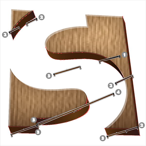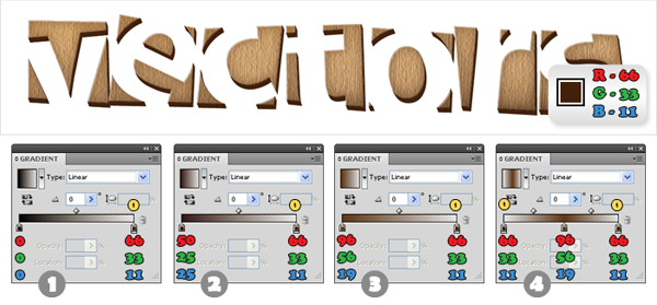 Now, let’s focus on the darker shapes. First, fill them all with R=66 G=33 B=11. Next, create the four gradients and save them in the Swatches panel. Simply name them "1", "2", "3" and "4". You’ll need them in the next step.