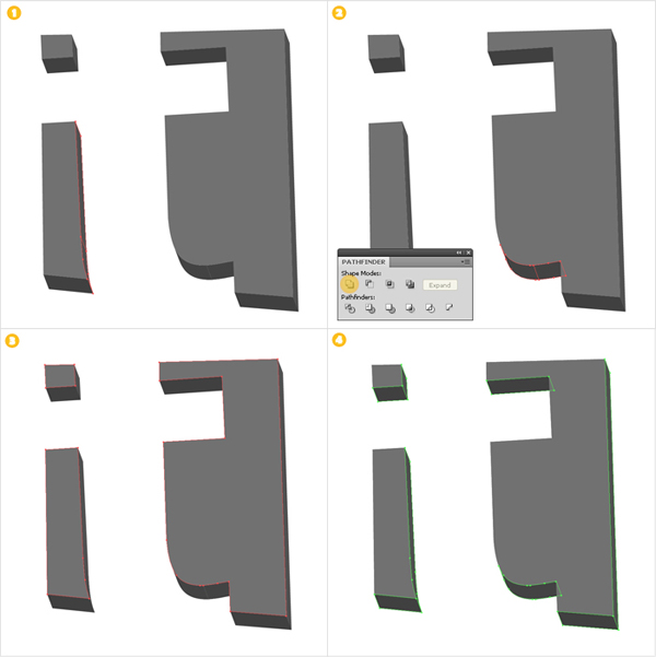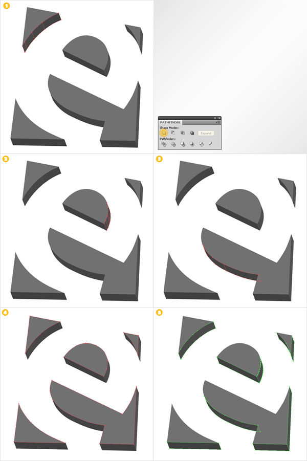 Let’s continue with the "e". Use the Unite button from the Pathfinder panel to connect the groups of shapes selected in images #1, #2 and #3. In the end, you must have two groups. One with the dark shapes (image #5) and one with the lighter shapes (image #4).