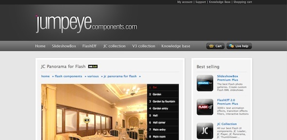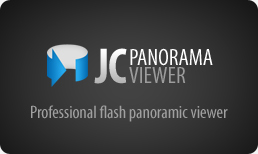 JC Panorama Viewer is a flash component that can be used to display several types of panoramic images: plain, cylindrical, spherical (equirectangular) and cubical. This flash panorama component supports hotspots (informative, web link and panorama), horizontal and vertical mouse movement, scroll zoom, transitions and virtual tours.
