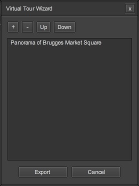 A Virtual Tour is a collection of panoramas displayed by a single swf. You can create a Virtual Tour by pressing the Make a virtual tour button in the new project screen and selecting the desired panoramas.