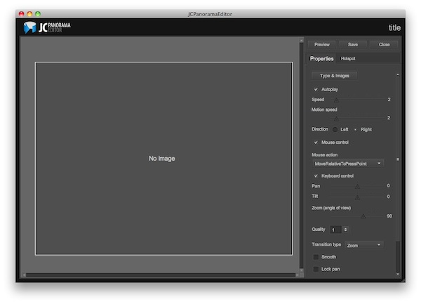 JC Panorama uses an AIR based clean interface with several options to generate your panorama viewer.