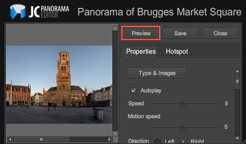 Once you proceed, a new screen will be revealed where you will see the image being used and an options panel at the right. Press the Preview button in the top-right part of the window to see your panorama in action.