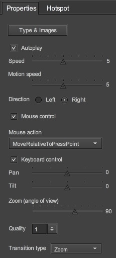 The Properties panel is located at the right part of the screen in the preview window, it shows the available options that you can choose to customize your panorama.