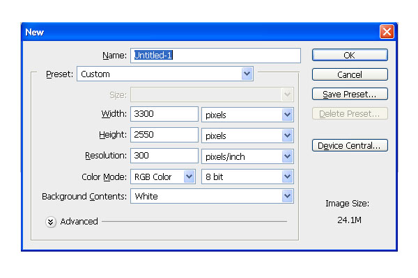 First, create a file 3300 x 2550 px with a resolution of 300 ppi.