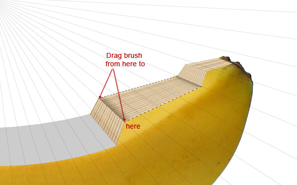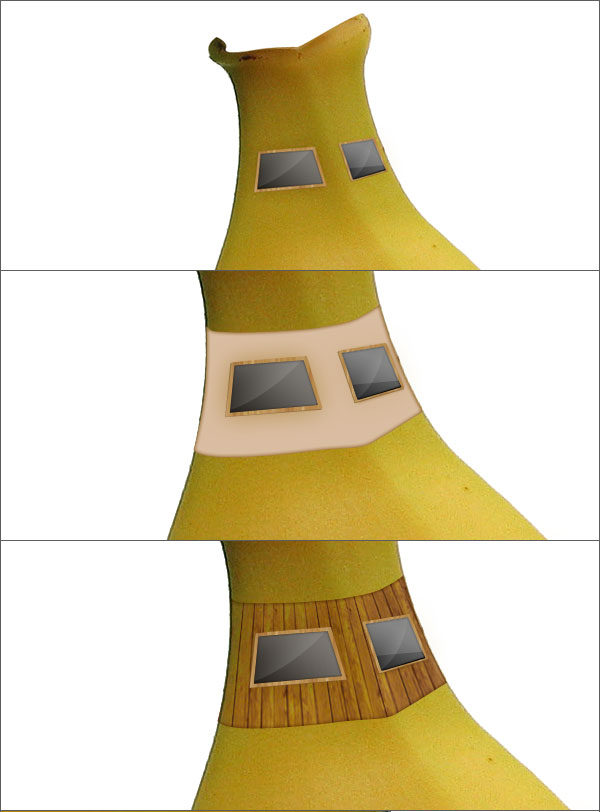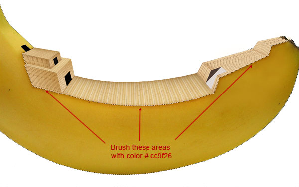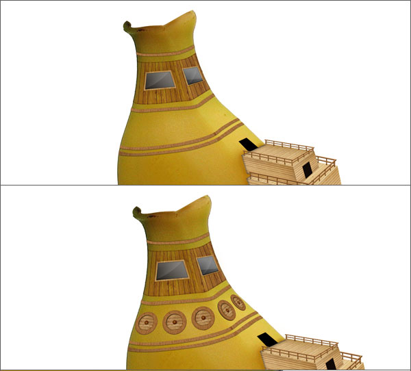 Group all wooden deck layers and then duplicate the group and merge it, name this layer "ship deck". Cmd/Ctrl + click the "banana" layer, then press Cmd/Ctrl + Alt and click the "ship deck" layer. You’ll get a selection of ship’s lower part. Now select a soft brush of color #cc9f26 and paint through the edges of ship deck, name this layer "deck shadow". Set its blending mode to multiply with opacity 70%.