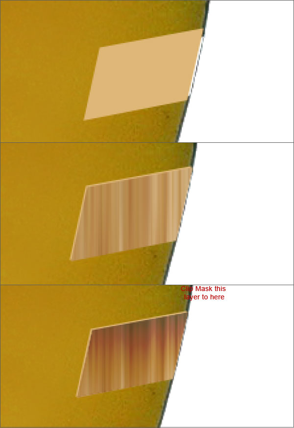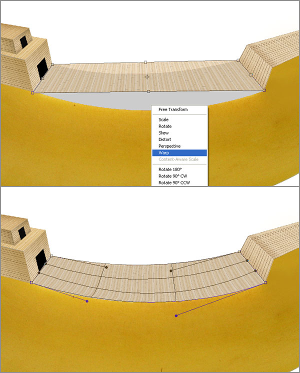 For the middle part, open the file "wood.jpeg". Free Transform (Cmd/Ctrl + T) and align corners with layer of middle part then Right click and click Warp then set it with middle part. Name this layer as "middle".