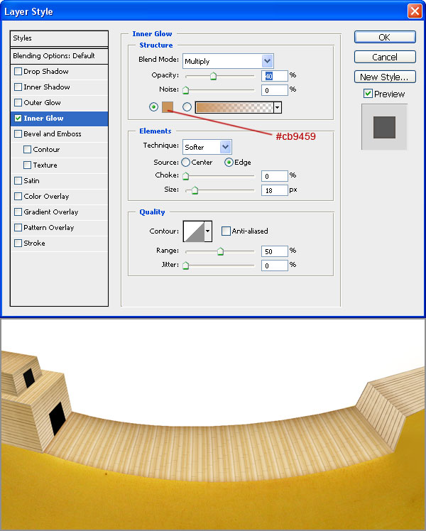 Repeat Step 35 to create windows on back part. Now we will create some texturing in this part. Create a shape of color #d9bda1, apply inner glow layer style with these settings; color #aa8640, opacity 75%, multiply. Name this layer to "wooden wall". Open "wood 2.jpeg" and create wood texture for window part, clip these texture layers to layer "wooden wall" then change its blending mode to darken.