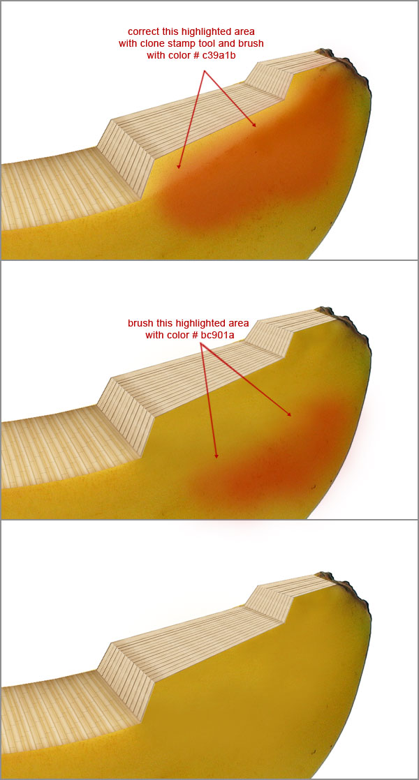 For the front part, create a new layer, select brush of size 100px and color #c39a1b, paint bright yellow area to match with rest part. Name this layer "color 1", use clone stamp tool if needed. Again select same brush with color #bc901a and paint on a new layer to make painting edges disappear, which we have created in previous color. Name this layer "color 2" and set blending mode to lighten.