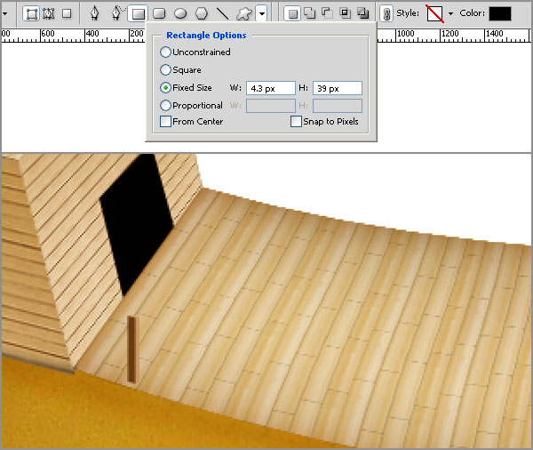 Now it’s time to create deck railings. Let’s start with middle part, turn on shape layer and select Rectangle Tool (U). Then go to Geometry Options > Rectangle Options > Fixed Size and set the width 4.5px and height 38px. Fill this rectangle with color #693b0f and name this layer to "front bar". Duplicate this layer and rename it "back bar", drag this layer behind "front bar" layer and change the color to #ca9561 then Group both layer and name group "vertical bar".