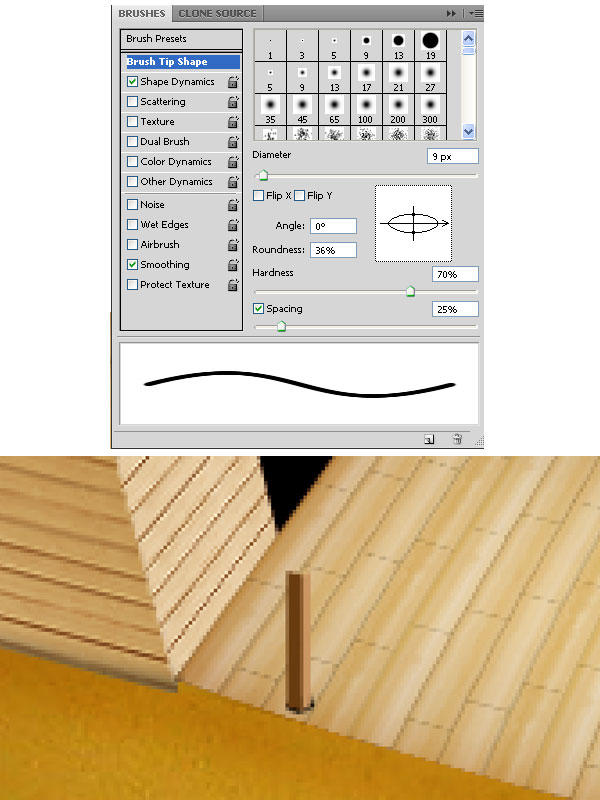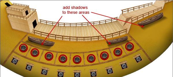 Now repeat Step 13 and create the flooring and walls of the front and back part of the ship deck. Select a soft brush of size 70 px with opacity 30% and color black, create the shadow wherever needed.