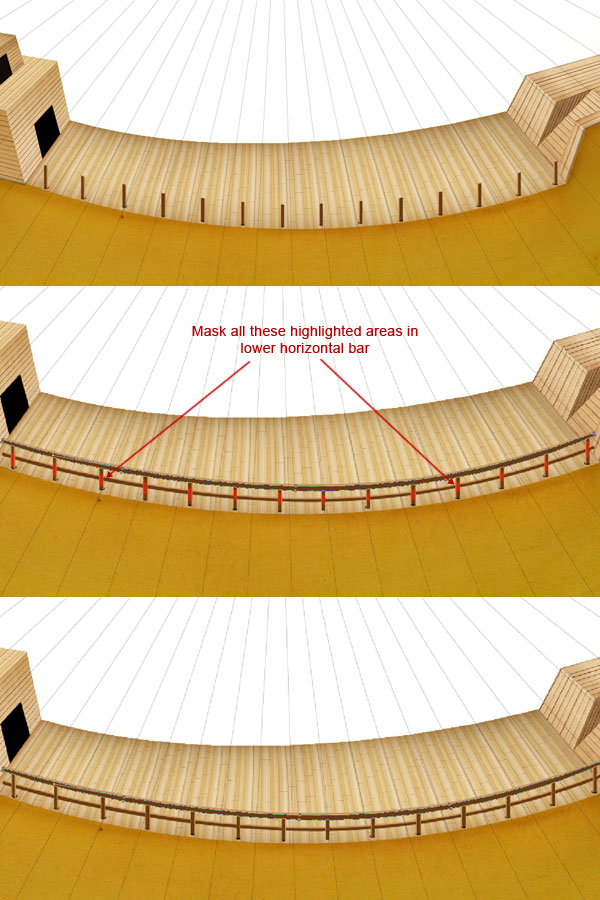 Duplicate the group "vertical bar" up to 13 times. Select Pen Tool, create a horizontal bar of color #693b0f and name it "Upper bar front". Duplicate this layer, fill it with color #ca9561 and rename layer to "Upper bar back", & drag this layer to back of "Upper bar front" layer then Group both layers and rename the group to "Upper horizontal bar". In next step duplicate the group "Upper horizontal bar" and rename it "Lower horizontal bar," drag it below "Upper horizontal bar" group. Add Layer Mask to hide the area where "Vertical bar" & "Horizontal bar" overlap. Group all railing layers and rename it to "Middle railing front".