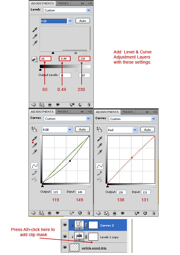 In this step we’ll create the lower part of the ship. Crop a section from file "wood 3.jpeg", copy & paste this to our main file with name "Strip". Add Level and Curve adjustment layer with these settings; Level: RGB – 65, 0.49, 230. Curve: RGB – Output-119, Input-149, Red – Output-138, Input-131. Then clip mask both adjustment layers to "Strip" layer.