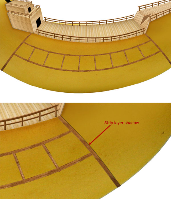 Duplicate layer "Strip" to extend to its length and create strips of lower part of the ship. Transform & wrap wherever needed. Create new layers just below strip layers, Cmd/Ctrl + click to get the selection of strip layer, fill it with black color & apply Gaussian Blur of 1px and set blending mode to multiply. Name this layer to "Strip shadow". Repeat same step to create shadow of other strips.