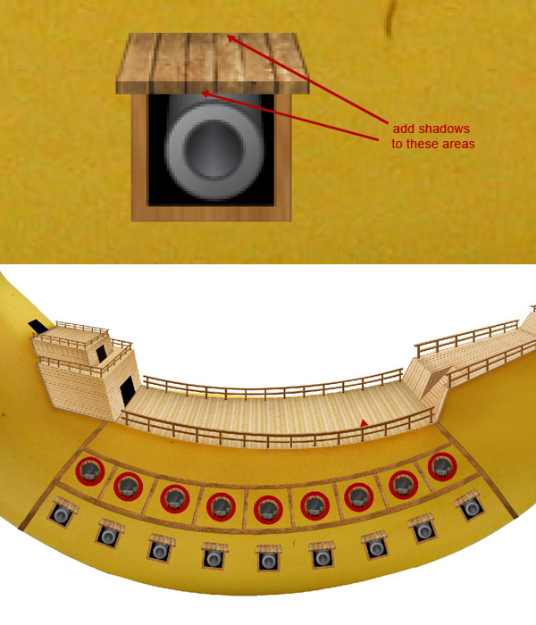 Go to File > Place and select "cannon.ai", create a rectangle of color #dfc8a4 and name it "Cannon window frame". Duplicate "Texture" layer and place just above cannon window texture & set blending mode to multiply and clip mask this layer with "Cannon window frame". To create window roof, open "wood 2.jpeg" and transform it to create cannon window roof. Use burn tool to create roof shadows then group all cannon window layer and name this group as "Cannon window". Duplicate cannon windows to create more windows.