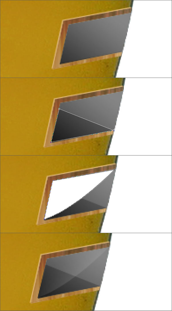 Create another black rectangle with 90% opacity, apply gradient layer style with colors #000000 & #787878, and name it "Front window glass". Press Cmd/Ctrl + click on the layer and mask area in the "Front window frame" and "banana" layer. Create another shape by pen tool of color black below "Front window glass" layer. Again create a new shape of color white and opacity 40%, apply layer mask to hide unwanted area, name this layer as "glass reflection".