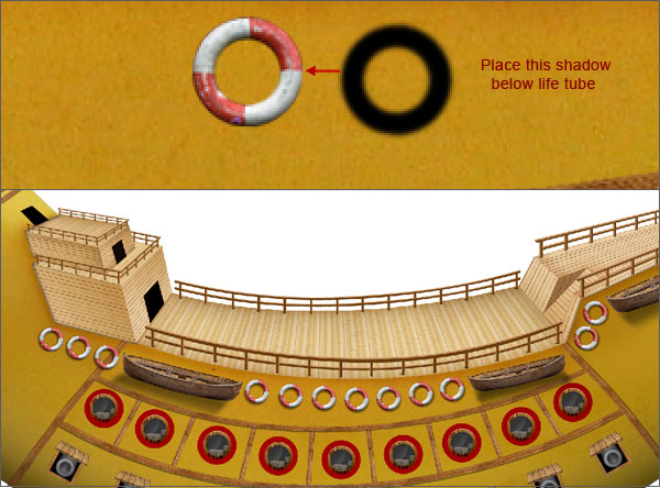Again, open "life tube.jpeg" and place it on ship, name this layer "life tube". Press Cmd/Ctrl then click on "life tube" layer to create new layer and fill it with color black. Apply Gaussian blur of 1 px, set blending mode multiply with opacity 40%. Name this layer to "Life tube shadow" and place this layer below Life tube layer. Group both layer and duplicate to create more lifeboats.