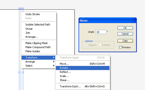 Now to make our art proportionally balanced, set a vanishing point. This is a one vanishing point image. To create vanishing point open Adobe Illustrator and choose a blank document. Select Line Segment Tool (\) and create line of length 30cm, keep its weight 0.25 pt then select the line and go to Right click > Transform > Rotate, set the angle to 10 and press "Copy" button.