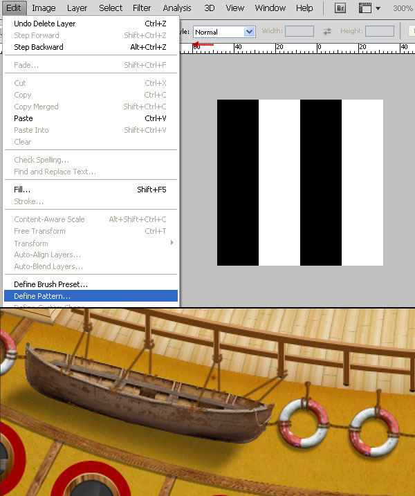 Now we will create ropes to bounding boats and life tubes. Create a new file of dimension 80 x 80 px, create two vertical bar of width 20 px and height 80 px. Merge all layer and go to Edit > Define Patten and save it. Go to our main file create new layer, select brush of size 3 px, hardness 100% & color to #6e4215 and draw ropes bounding boat and life tubes to ship. Name this layer to "rope".