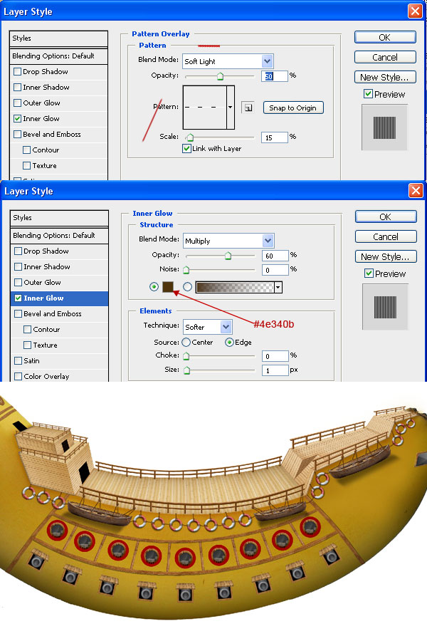 Apply inner glow and pattern overlay layer styles in layer "rope".