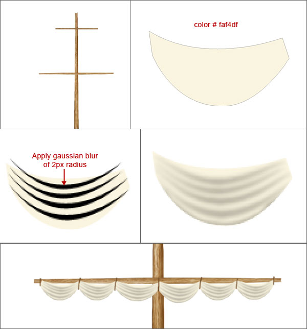 Cut a section of wood from "wood 2.jpeg", extend its texture by copying and transform it to create centre pole. Select soft brush of color black and darken from edges to give it depth. Now we will create curtain of pole, make a shape of color #faf4df, and turn on Shape Layer. Next create some black arc and apply Gaussian blur of radius 2px. Group these layers and name it "Cloth". Duplicate to create curtain on horizontal poles.