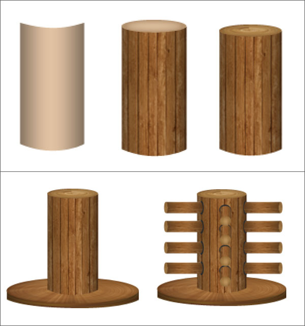 In this step we will create a rotating wooden wheel, for this make a rectangle of color #e1c2a2, open "wood 2.jpeg", clip this image to rectangle and set blending mode to multiply. Create an ellipse of color #elc2a2, open "wood cross section.jpeg" and clip this image to ellipse. Set its blending mode to darken, select wooden beam layers, group them and name group to "beam". Create lower base of beam, next duplicate group "beam" and resize it to create rotating handles. Group these layers and name it "Rotating wheel".
