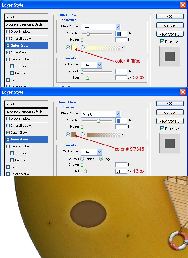 To create wings of Ship, first make a wing hole where wings will be attached in next step make a ellipse of color #694d2b, apply inner glow and outer glow layer style with these settings – Inner glow: blending mode – multiply, opacity – 50%, color – #9f7845, size – 13px. Outer glow: blending mode – screen, opacity – 20%, color – #ffffbe, size – 32px.