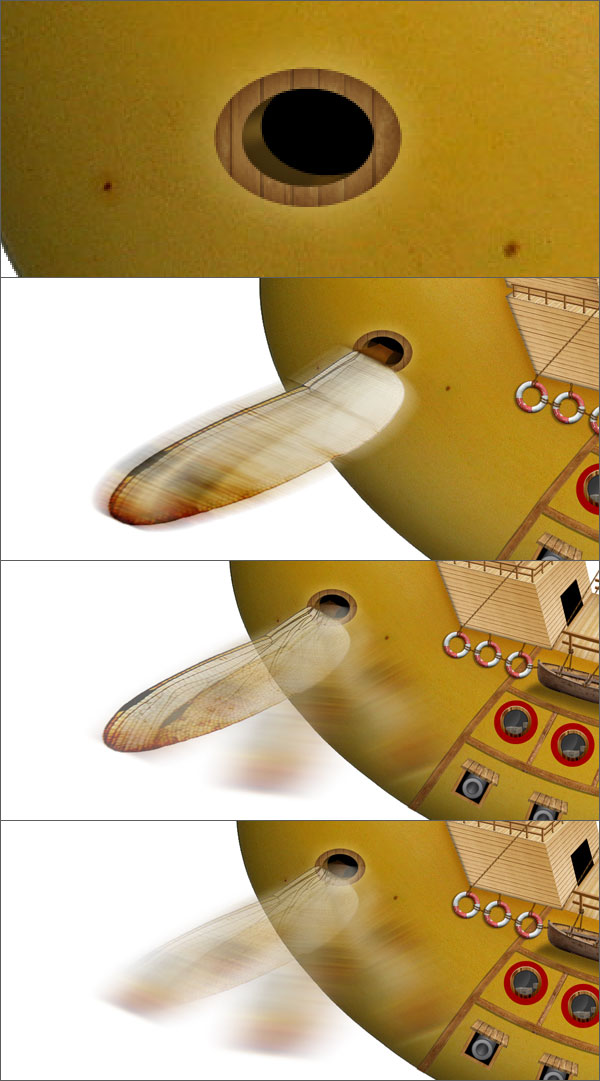 Clip "wood 2.jpeg" to ellipse, set blending mode to soft light, create another ellipse of color #43310e and clip another ellipse of color black inside it, group layers and name it "wing hole". Open "dragon fly.jpeg", isolate wing and place it in wing hole. Duplicate wing layer and apply motion blur of angle -24 degree and distance 60px, name this layer to "motion". Duplicate "motion" layer, transform & rotate it, set "wing" and "motion" layer’s opacity to 60%. Select Gradient Tool (G) with color black and white and mask tip area of "wing" layer. Our wings are ready.