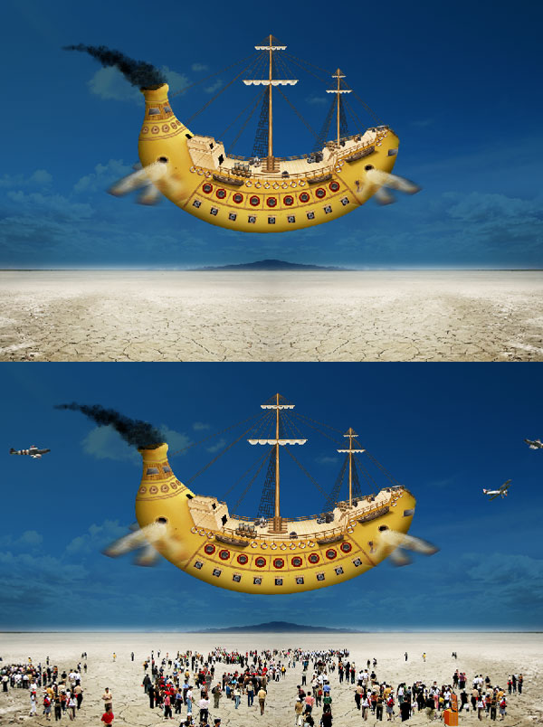 Go to File > Place and import banana ship to document. Open "aircraft 1.jpeg", "aircraft 2.jpeg" and "aircraft 3.jpeg", remove the backgrounds of the images and place them in sky. Again open "crowd.jpeg", remove its background and place it on the the land perspectively.