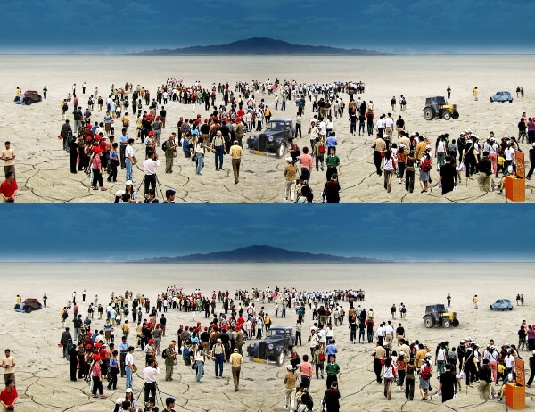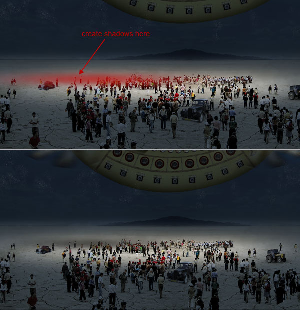 Open "car.jpeg", "black car.jpeg", "truck.jpeg" and "tractor.jpeg". Place them with crowd and create shadows carefully.