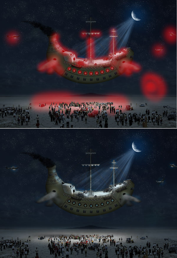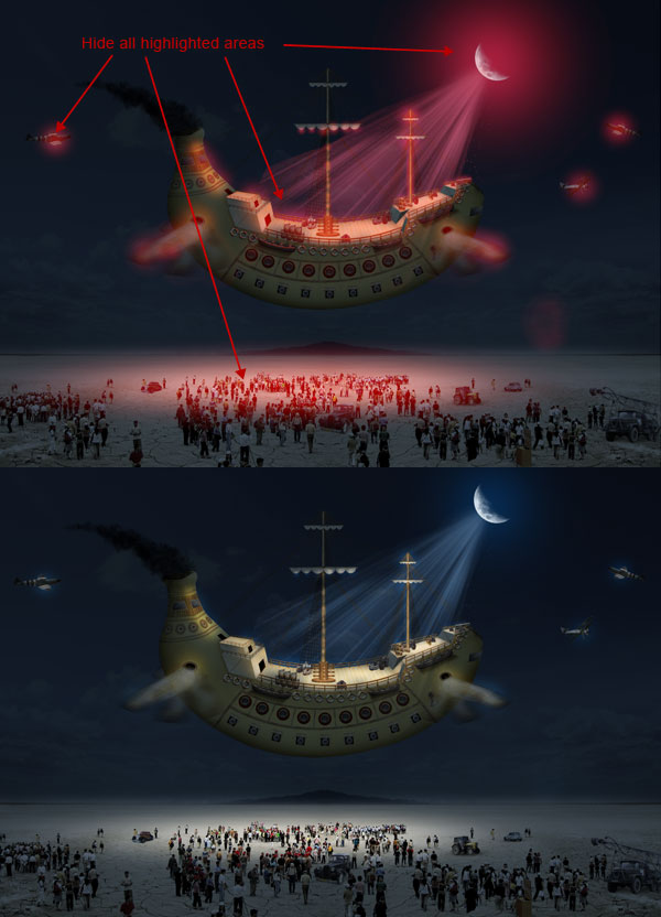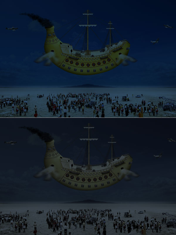 Add layer mask to the group "night", select foreground color black and hide areas to create light coming from moon. Create lights in every place where moonlight falls eg. rope, pole, boxes, floors, etc.
