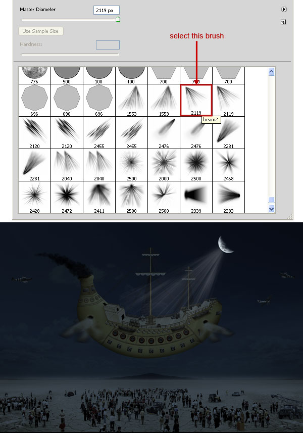 Select brush tool and load a set of moon brushes, set foreground color white and create a moon on sky. Next we will create moon rays so a set of light ray brushes, set the opacity 30%. Add layer mask to the group "night", select foreground color black and hide areas where light is falling from light source.