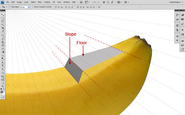 After doing that, select the pen tool by pressing P and create rectangle in perspective, name this shape layer as "slope". Make sure to turn the Shape layer on because we’ll use it later & create another rectangle to make floor and name it "floor".