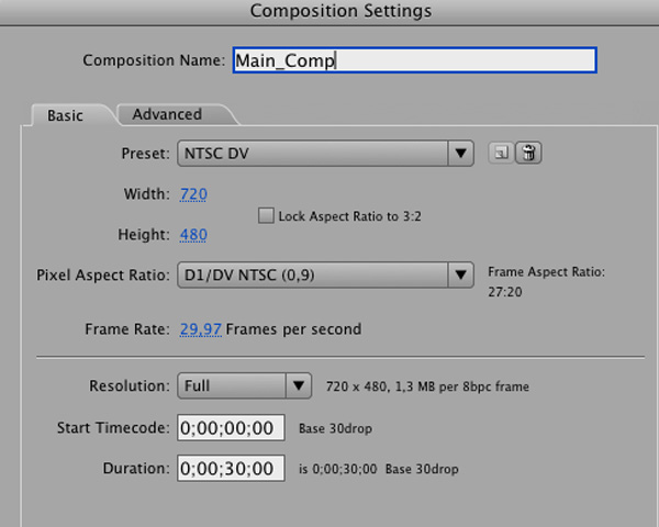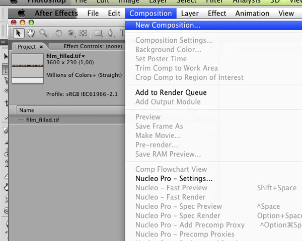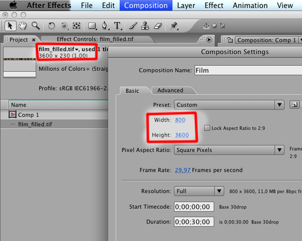 Now in After Effects, import the filled film, then create a new composition. ‘Composition’ > ‘New Composition’. Put ‘Film’ in name.