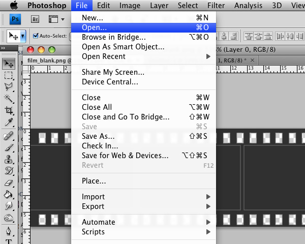First step is to open a filmstrip impage filled with pics or not. If you don’t have one, just download one filled HERE or blank HERE.