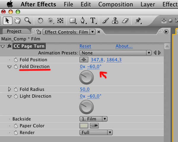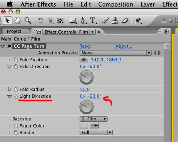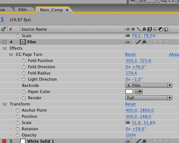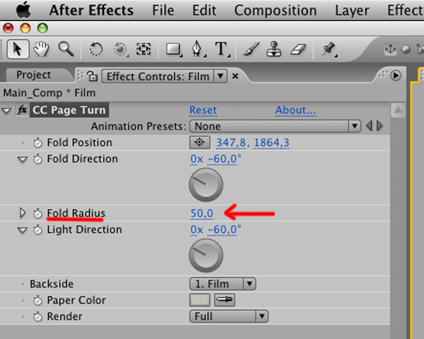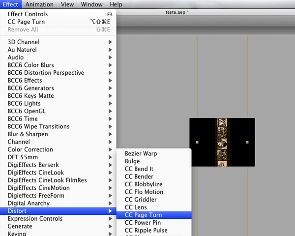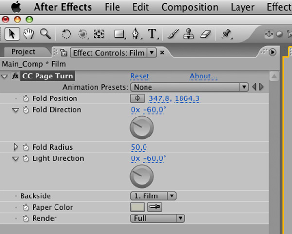 In the ‘Main Comp’, select ‘Film’ comp and choose ‘Effect’ > ‘Distort’ > ‘CC Page Turn’.