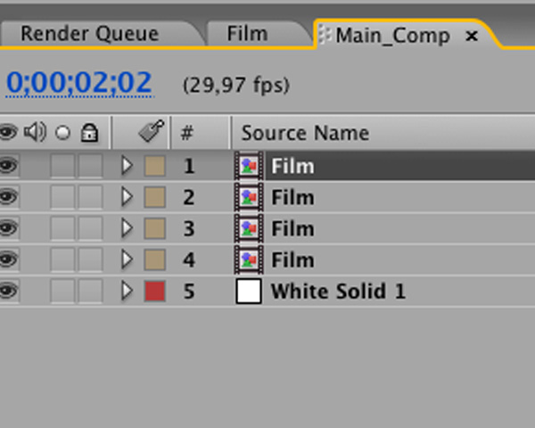 Now, in ‘Main Comp’, select the ‘Film’ comp and duplicate. As many copies as you prefer. Select and go to ‘Edit’ > ‘Duplicate’. Repeat.