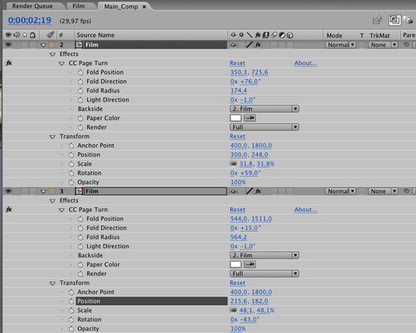 In ‘CC Page Turn’, change the values and see the effects. Your principle changes are: ‘Fold Direction’, ‘Fold Radius’, Light Direction’. These modifications will give the “turn” effect to the strips.